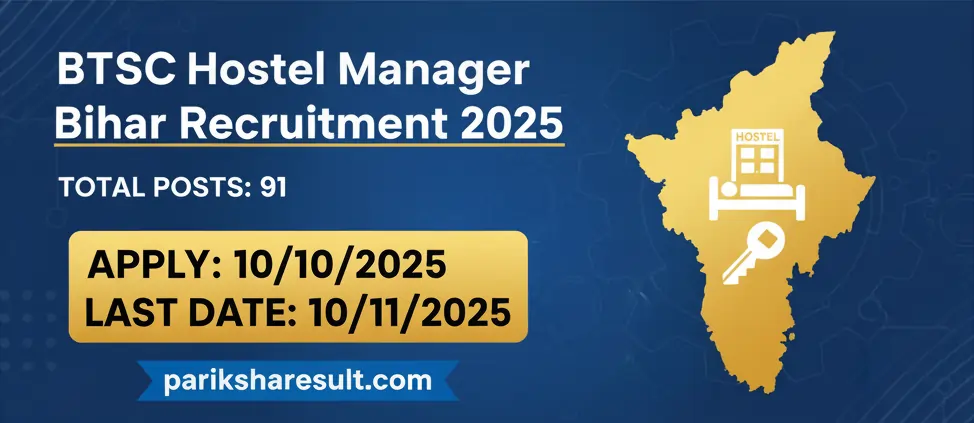 Bihar Technical Service Commission (BTSC) has released the notification for the BTSC Hostel Manager Bihar Recruitment 2025 on its official website Bihar Technical Service Commission (BTSC). Various posts are included in this recruitment. online application form for the BTSC Hostel Manager Bihar Recruitment 2025 started on 05/12/2025, and eligible candidates can apply until 05/01/2026. minimum age for recruitment is 21 Years. and the maximum age is 37 Years. age will be calculated as of 01/08/2025. Candidates are advised to go through the complete details of the BTSC Hostel Manager Bihar Recruitment 2025 provided below.